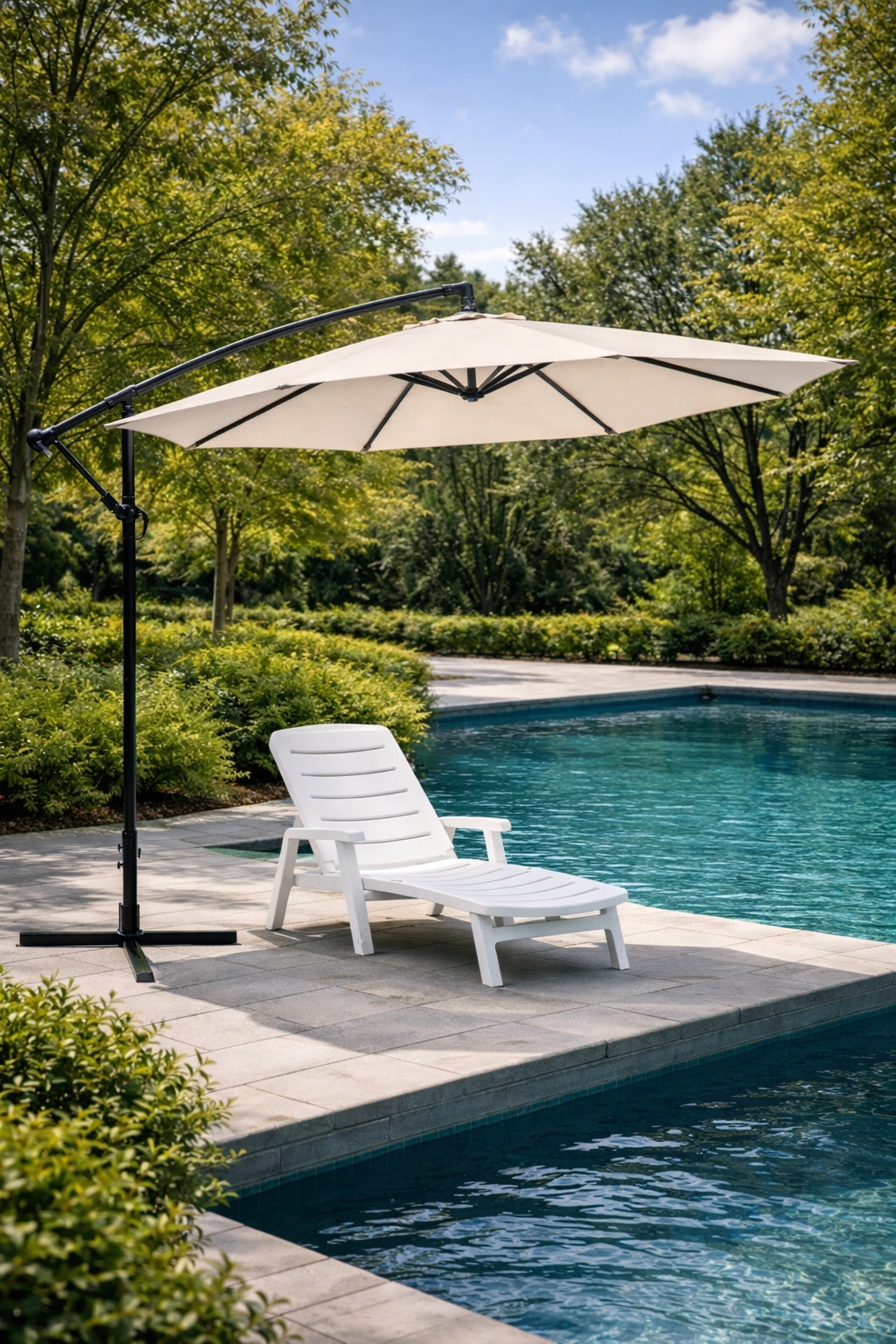 Sombrilla lateral de 3 metros con estructura de acero y tela poliéster de alta resistencia. Ideal para terrazas, patios, bares y mucho más.