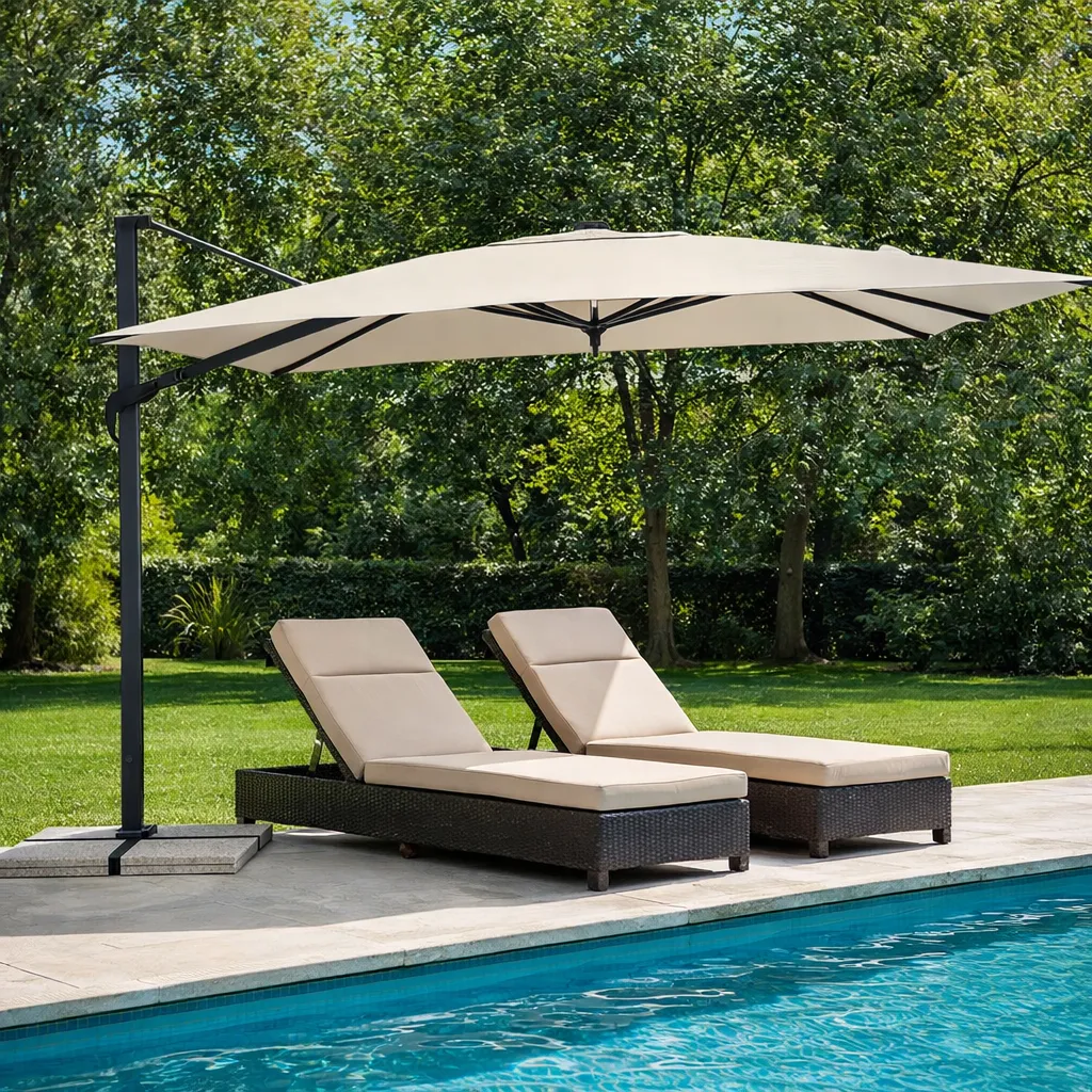 Sombrilla de jardín 4x4 con estructura de aluminio con recubrimiento de polvo (poliéster), mástil giratorio 360°, inclinación vertical ajustable y funda de noche incluida. Ideal para espacios exteriores de alta exigencia y uso profesional.